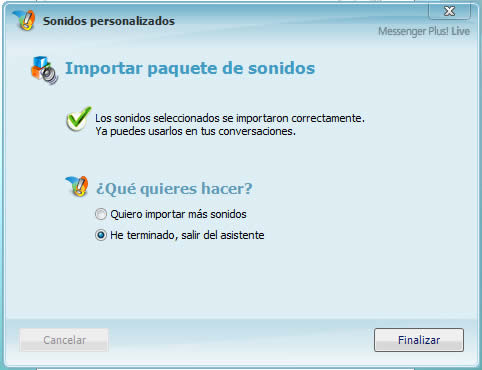 Within the section custom sounds, you can manage your sounds, editing, deleting or adding new sounds to your library. The MSN Plus Live allows you to add sounds in different audio formats from your computer, and also import packages of sounds in PLP format.
